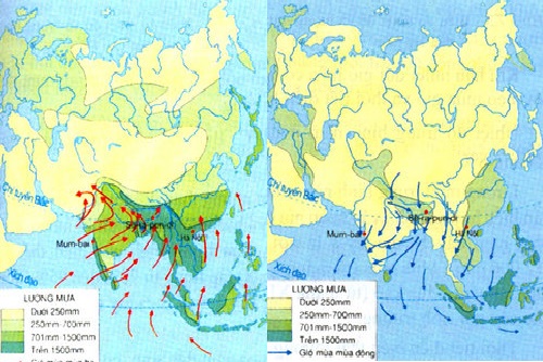 Câu 2: Quan sát các hình 7.1 và 7.2, nhận xét về hướng gió thổi vào mùa hạ và vào mùa đông ở các khu vực Nam Á và Đông Nam Á. Giải thích tại sao lượng mưa ở các khu vực này lại có sự chênh lệch rất lớn giữa mùa hạ và mùa đông?