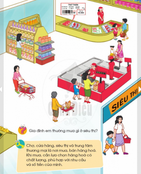 - Gia đình em thường mua quần áo, trái cây, rau xanh, nước uống ở siêu thị.