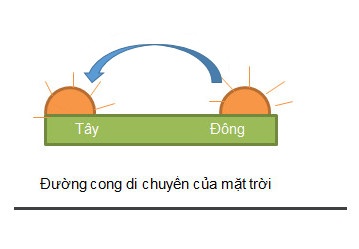 Em hãy vẽ đường cong di chuyển của Mặt Trời trong một ngày vào vở với phía đông và phía tây như hình vẽ.