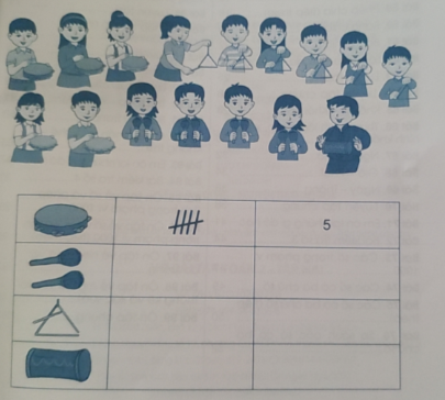 Bài 6. Xem tranh rồi kiểm đếm số lượng mỗi nhạc cụ mà các bạn đang cầm và ghi lại kết quả (theo mẫu):