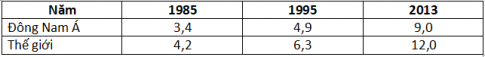 Câu 27: Nhận xét nào sau đây không đúng về tỉ trọng diện tích cao su của Đông Nam Á so với thế giới giai đoạn 1985 – 2013?