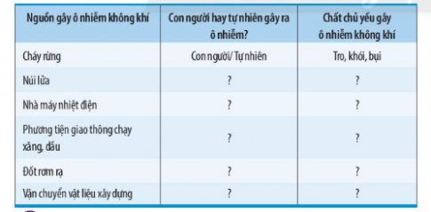 - Em hãy nêu một số nguồn gây ô nhiễm không khí và đề xuất biện pháp khắc phục