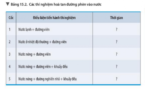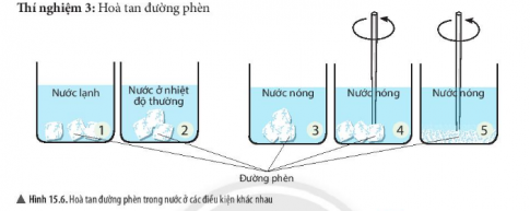 Cho 3 viên đường phèn đã nghiền nhỏ vào cốc 5. Dùng đũa thuỷ tinh khuấy đều cốc 4 và 5. Dùng đồng hồ bấm giây ghi lại thời gian từ khi bắt đầu cho đường vào mỗi cốc cho đến khi đường tan hết trong nước tạo ra hỗn hợp đồng nhất.