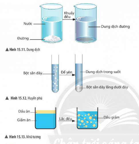 - Từ các hình 15.11 đến 15.13, hãy phân biệt dung dịch, huyền phù và nhũ tương.