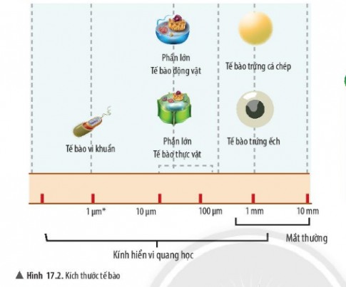 - Quan sát hình 17.2, hãy cho biết kích thước của tế bào. Chúng ta có thể quan sát tế bào bằng những cách nào? Lấy ví dụ