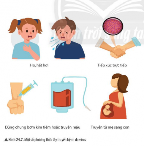 - Từ thông tin gợi ý trong hình 24.7, hãy cho biết bệnh do virus có thể lây truyền qua những con đường nào?