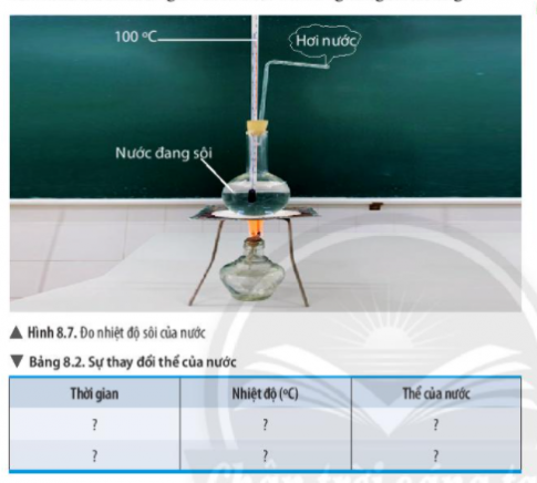 - Thực hiện thí nghiệm 1 (hình 8.7) và ghi kết quả sự thay đổi nhiệt độ hiển thị trên nhiệt kế sau mỗi phút theo mẫu bảng 8.2. Trong suốt thời gian nước sôi, nhiệt độ của nước có thay đổi không?