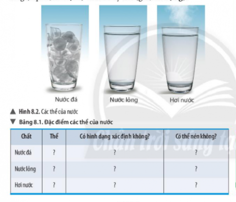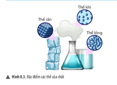 - Quan sát hình 8.3, hãy nhận xét đặc điểm về thể rắn, thể lỏng và thể khí của chất