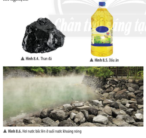 - Em hãy nhận xét về thể và mùa sắc của than đá, dầu ăn, hơi nước trong các hình 8.4,8.5 và 8.6