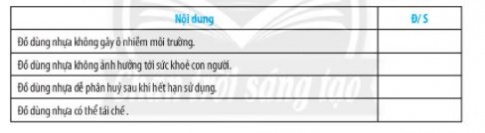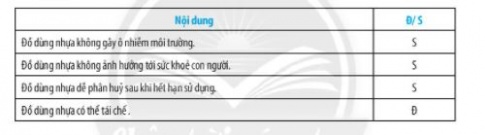 Câu 11.9. Ghi đúng (Đ), sai (S) vào ô phù hợp đối với các nhận xét về đồ dùng bằng nhựa.