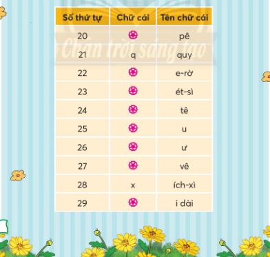 b) Tìm chữ cái thích hợp với mỗi chỗ trống. Học thuộc tên các chữ cái trong bảng.