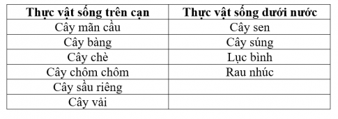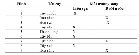Chỉ và nói tên cây sống ở trên cạn, cây sống dưới nước trong các hình dưới đây? Hoàn thành bản theo gợi ý dưới đây rồi chia sẻ với các bạn trong nhóm?