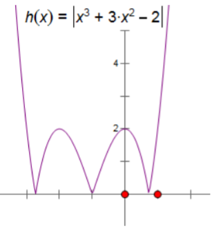ta chỉ lấy trong khoảng $ x \in [-1-\sqrt{3},-1] \cup [-1+\sqrt{3}, +\infty)$ và đồ thị $y=-(x^{3}+3x^{2}-2)$ ta lấy trong khoảng $x \in (-\infty, -1-\sqrt{3}) \cup (-1, -1+\sqrt{3})$. Ta có đồ thị hàm số $y=|x^{3}+3x^{2}-2|$ như sau