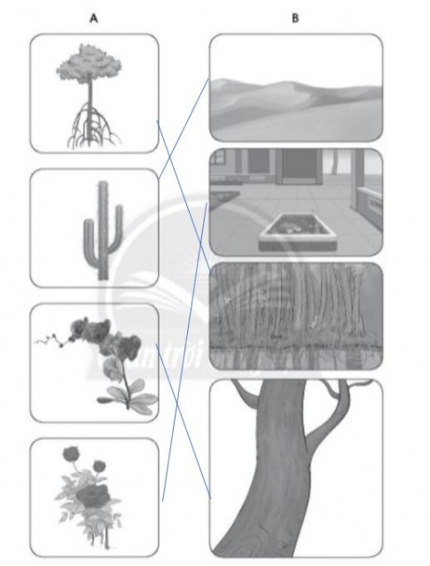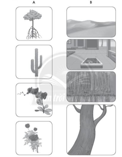 | Cây dừa, cây xoài, cây thông, cây xương rồng, cây cam.... | Bông sen, bông súng, cây đước... |