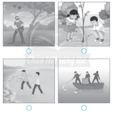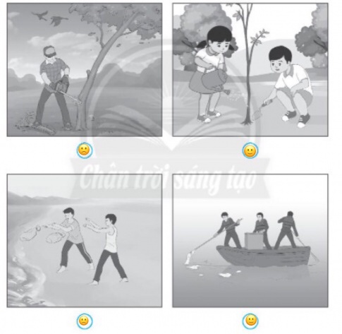 Câu 1. Vẽ mặt cười vào O dưới hình chỉ việc làm em đồng tình, và mặt buồn vào O Dưới hình chỉ việc làm em không đồng tình.