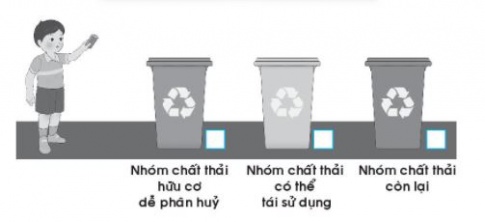Câu 5. Bạn Nam vừa uống xong hộp sữa. Bạn không biết bỏ vỏ hộp sữa vào thùng rác nào. Em hãy gúp bạn bằng cách đánh dấu V vào ô trống cạnh hình phù hợp với nhóm chất thải.
