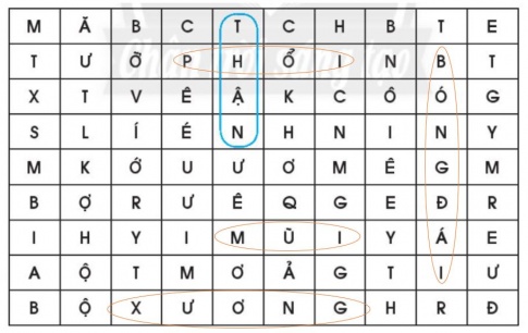 Câu 1. Quan sát hình và tìm khoanh các từ chỉ tên gọi phù hợp trong bảng chữ dưới đây (theo mẫu).