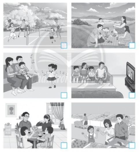 Câu 1. Đánh dấu V vào ô trống ở hình chỉ những hoạt động mà em và gia đình đã cùng nhau thực hiện.