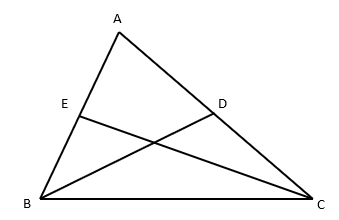a) Ta thấy tia BD cắt đoạn thẳng AC tại D nằm giữa hai điểm A và C. Do đó tia BD nằm giữa hai tia BA và BC nên đường thẳng BD cắt đoạn thẳng CE. Chứng minh tương tự ta có đường thẳng CE cắt đoạn thẳng BD.