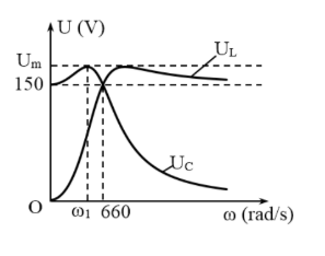 , chúng được biểu diễn bằng các đồ thị như hình vẽ bên, tương ứng với các đường $U_{C}$, $U_{L}$. Khi $\omega = \omega _{1}$ thì $U_{C}$ đạt cực đại là $U_{m}$. Giá trị của $U_{m}$ là