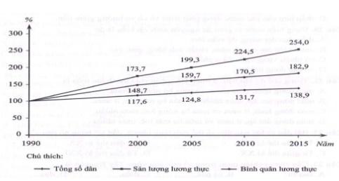 - A. Tốc độ tăng trưởng tổng số dân,sản lượng lương thực và bình quân lương thực theo đầu người của nước ta năm 2015.