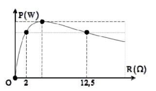 Câu 39: Đặt vào hai đầu đoạn chứa biến trở R một nguồn điện ξ = 20 V và điện trở trong r. Thay đổi giá trị của biến trở thì thấy đồ thị công suất tiêu thụ trên toàn mạch có dạng như hình vẽ. Công suất tiêu thụ cực đại trên mạch là: