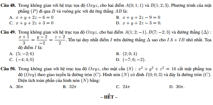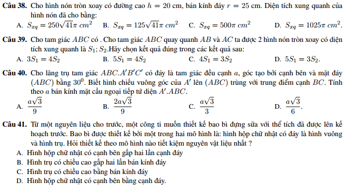 Câu 39: Cho tam giác ABC vuông tại A có AB=4, AC=3. Cho tam giác ABC quay quanh AB và AC ta được hai hình nón tròn xoay có diện tích xung quanh là