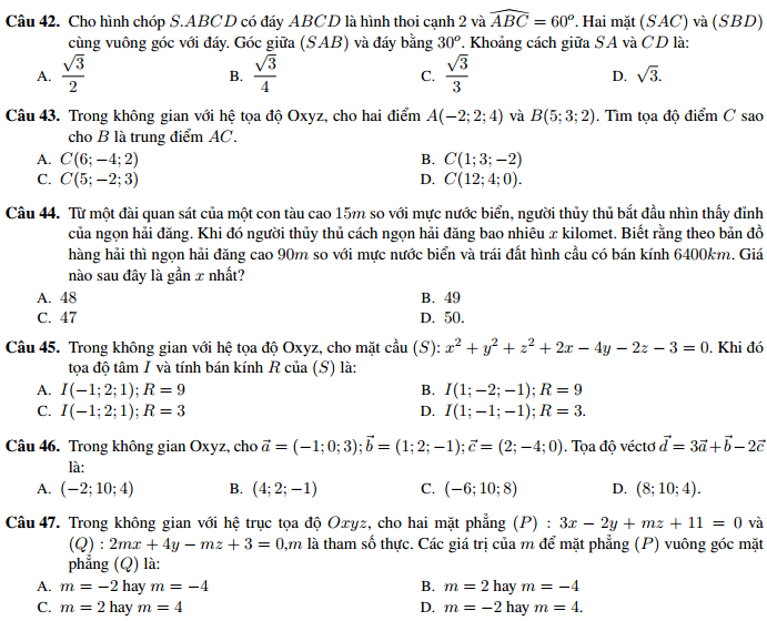 Câu 44: Từ một đài quan sát của một con tàu cao 15m so với mực nước biển, người thủy thủ bắt đầu nhìn thấy đỉnh của ngọc hải đăng. Khi đó người thủy thủ cách ngọn hải đăng x(km). Biết rằng theo bản đồ hàng hải thì ngọn hải đăng cao 90m so với mực nước biển và trái đất hình cầu có bán kính 6400km. Giá trị nào gần x nhất?