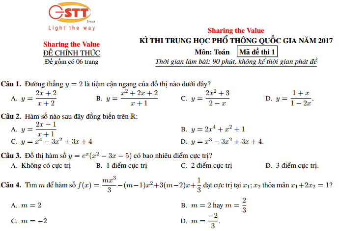 Đề thi thử THPT quốc gia môn toán năm 2017 của GSTT