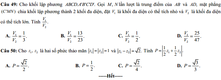 Câu 49: Cho khối hình lập phương ABCD.A'B'C'D'. Gọi M, N lần lượt là trung điểm của AB và AD, mặt phẳng (C'MN) chia khối lập phương thành 2 khối đa diện, đặt