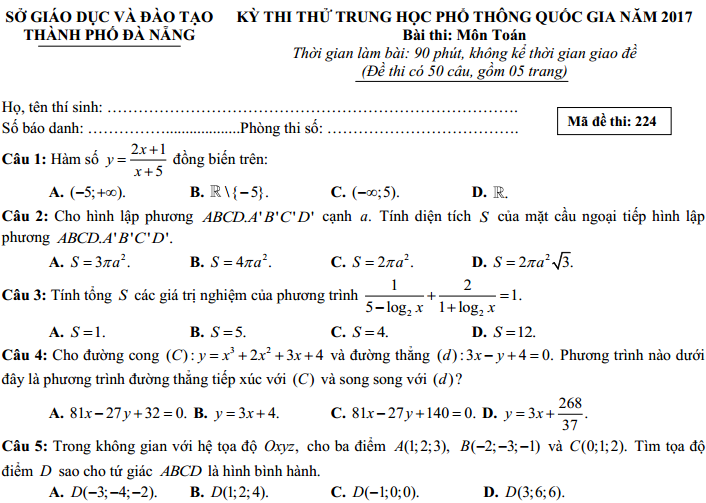 Đề thi thử THPT quốc gia môn toán năm 2017 của Sở GD và ĐT Đà Nẵng