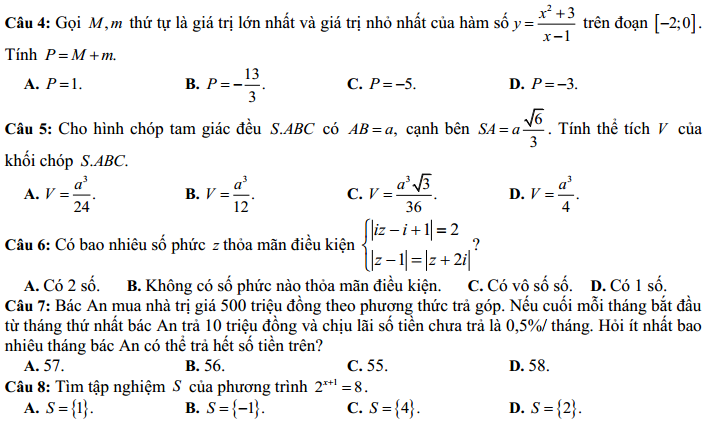 Câu 7: Bác An mua nhà trị giá 500 triệu đồng theo phương thức trả góp. Nếu cuối mỗi tháng bắt đầu từ tháng thứ nhất bác An trả 10 triệu đồng và chịu lãi số tiền chưa trả là 0,5%/tháng. Hỏi ít nhất bao nhiêu tháng bác An có thể trả hết số tiền trên?