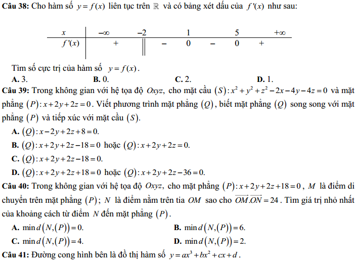 Câu 40: Trong không gian với hệ tọa độ Oxyz, cho mặt phẳng (P): x+2y+2z+18=0, M là điểm di chuyển trên mặt phẳng (P), N là điểm nằm trên tia OM sao cho
