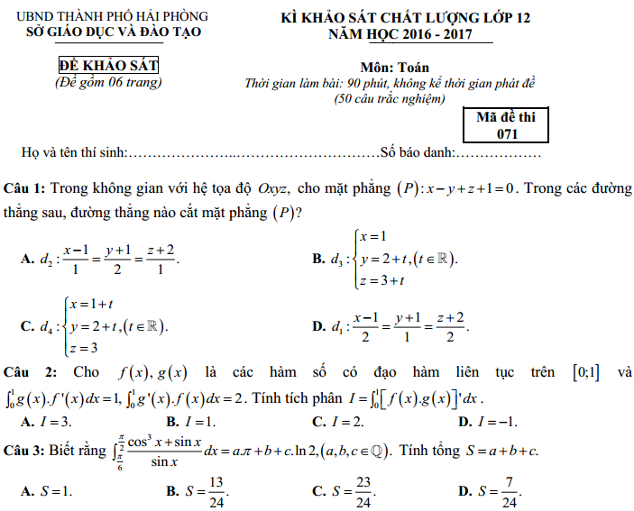 Đề thi thử THPT quốc gia môn toán năm 2017 của Sở giáo dục và đào tạo tỉnh Hải Phòng