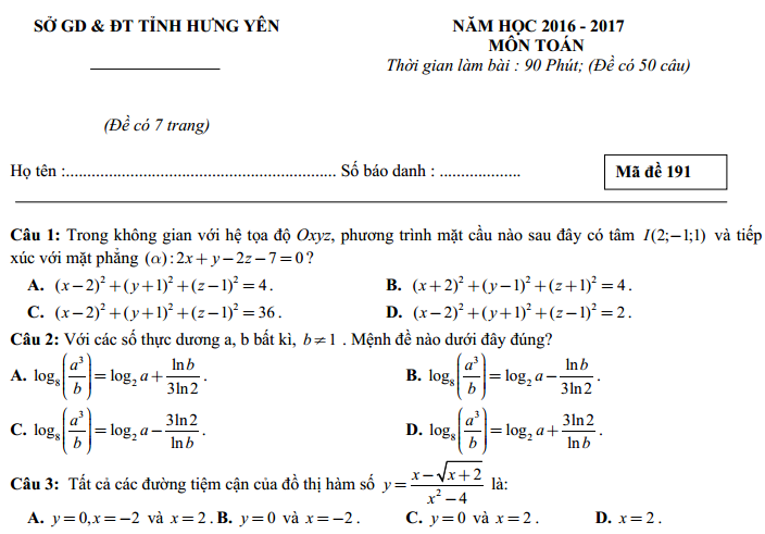 Đề thi thử THPT quốc gia môn toán năm 2017 của Sở giáo dục và đào tạo tỉnh Hưng Yên