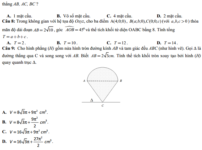 Câu 9: Cho hình phẳng (H) gồm nửa hình tròn đường kính AB và tam giác đều ABC như hình vẽ. Gọi