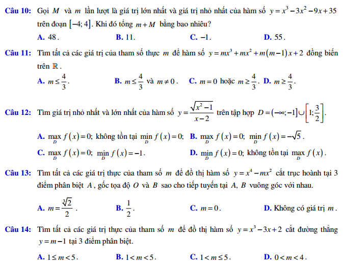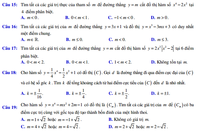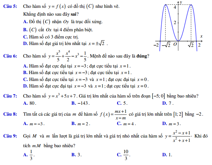 Câu 1: Đồ thị hàm số nào sau đây có 3 điểm cực trị?