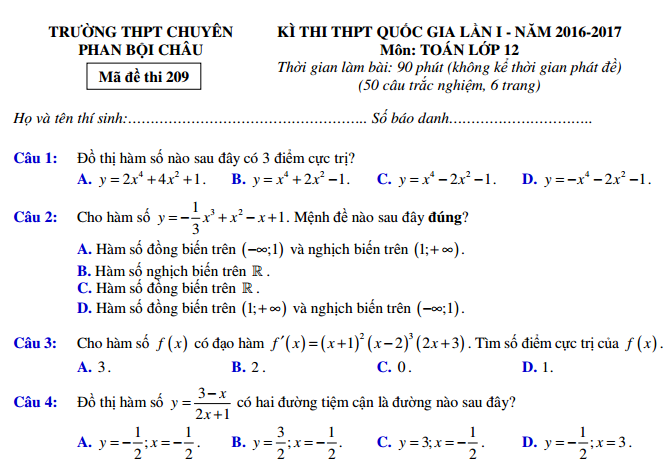 Đề thi thử THPT quốc gia môn toán năm 2017 của trường THPT chuyên Phan Bội Châu lần 1