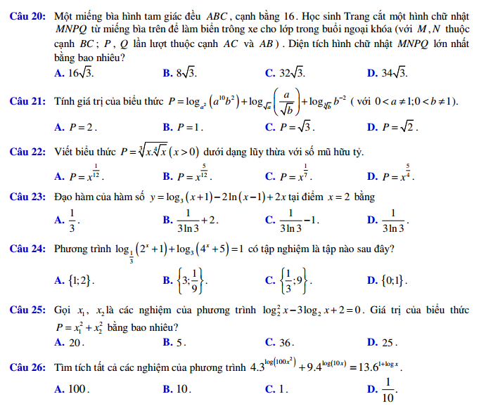 - Thi THPTQG 2020: Đề thi và đáp án môn Toán mã đề 106