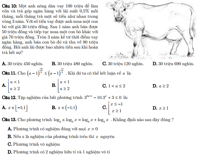 Câu 10: Một anh nông dân vay 100 triệu để làm vốn và trả góp ngân hàng với lãi suất 0,5% mỗi tháng, mỗi tháng trả một số tiền như nhau trong vòng 3 năm. Với số tiền vay được anh mua một con bò với giá 30 triệu đồng. Sau 1 năm anh bán được 50 triệu và tiếp tục mua một con bò khác với giá 70 triệu đồng. Tròn 3 năm kể từ thời điểm vay ngân hàng, anh bán con bò đó và thu về 90 triệu đồng. Hỏi anh lãi được bao nhiêu tiền sau khi hoàn trả hết nợ?