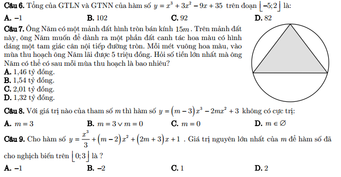 Câu 7: Ông Năm có một mảnh đất hình tròn bán kính 15m. Trên mảnh đất này, ông Năm muốn để dành ra một phần đất canh tác hoa màu có hình dáng là một tam giác cân nội tiếp đường tròn. Mỗi mét vuông hoa màu vào mùa thu hoạch ông Năm lãi được 5 triệu đồng. Hỏi số tiền lớn nhất mà ông Năm có thể có sau mỗi mùa thu hoạch là bao nhiêu?