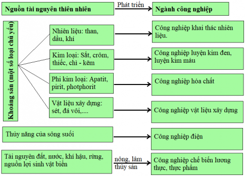 Đọc thông tin kết hợp với những hiểu biết của em, hãy lập và hoàn thành sơ đồ theo yêu cầu dưới đây về các nguồn tài nguyên thiên nhiên để phát triển các ngành công nghiệp tương ứng
