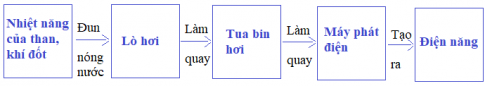 Dựa vào nọi dung trên và quan sát các hình vữ sơ đồ nhà máy nhiệt điện và nhà máy thủy điện, em hãy lập sơ đồ tóm tắt quy trình sản xuất điện năng ở các nhà máy theo gợi ý sau: