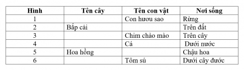 Em cùng bạn đặt và trả lời câu hỏi về nơi sống của cây và con vật trong các hình dưới đây? Hoàn thành bảng theo gợi ý dưới đây rồi chia sẻ với các bạn trong nhóm?