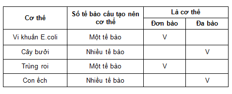 - Vẽ lại bảng và xác định các cơ thể đơn bào, đa bào bằng cách hoàn thành bảng theo mẫu sau vào vở: