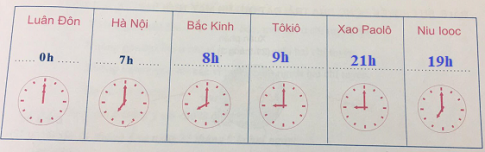 Dựa vào bản đồ múi giờ trên thế giới ở hình 1 và đồng hồ vẽ ở bảng dưới đây, em hãy điền tiếp vào chỗ chấm (...) giờ của các địa phương ở bảng cho đúng.