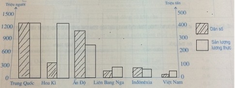 Dựa vào bảng số liệu về sản lượng lương thực và dân số của một số nước trên thế giới năm 2007, em hãy vẽ biểu đồ cột thể hiện sản lượng lương thực và dân số của các nước này: