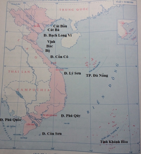 Dựa vào nội dung sách giáo khoa và atlat địa lý Việt Nam, em hãy điển vào chỗ chấm (…) của lược đồ dưới đây tên các đảo: Phú Quốc, Côn Sơn, Phú Quý, Lý Sơn, Cồn Cỏ, Bạch Long Vỹ, Cái Bầu, Cát Bà: tên vịnh bức bộ; tên tỉnh, thành phố của hai quần đảo Hoàng Sa và Trường Sa.