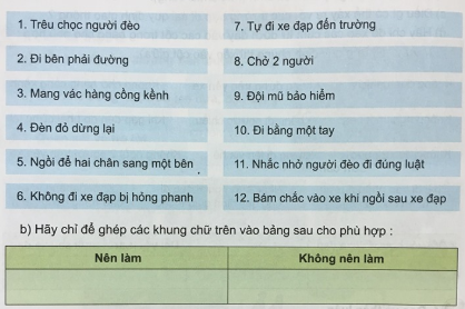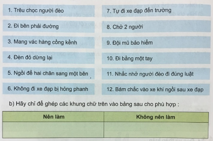 Hãy chỉ để xếp các cụm từ dưới đây vào các cột trong bảng cho phù hợp