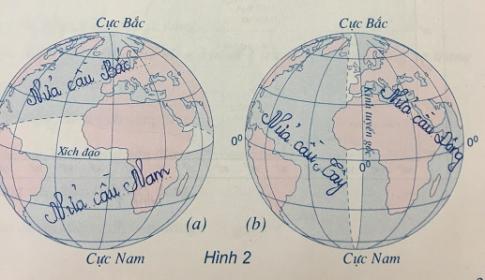 Điền tiếp vào chỗ chấm (...): nửa cầu Bắc, nửa cầu Nam, nửa cầu Đông, nửa cầu Tây vào hình 2 cho đúng.